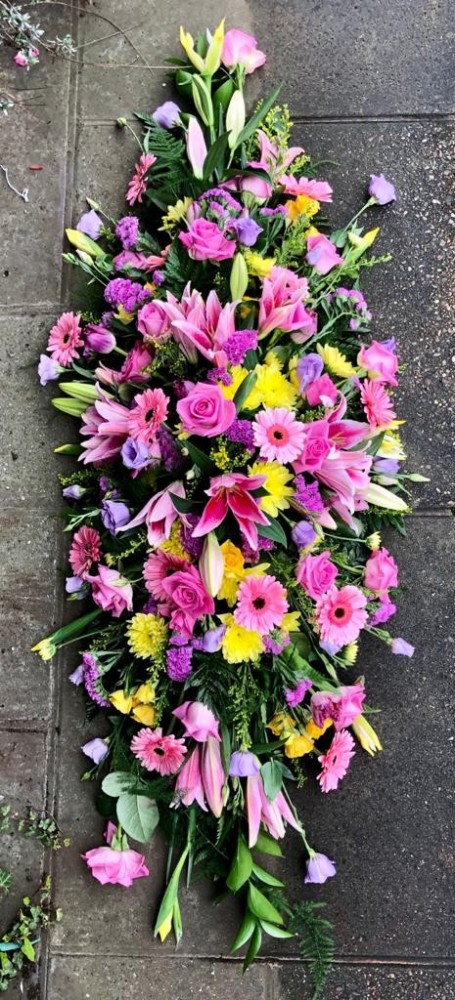 This pink and yellow, double-ended coffin spray is made up in the florists' selection of stems including Roses and Carnations against green foliage and is available in 2 different lengths; 4ft or 5ft.