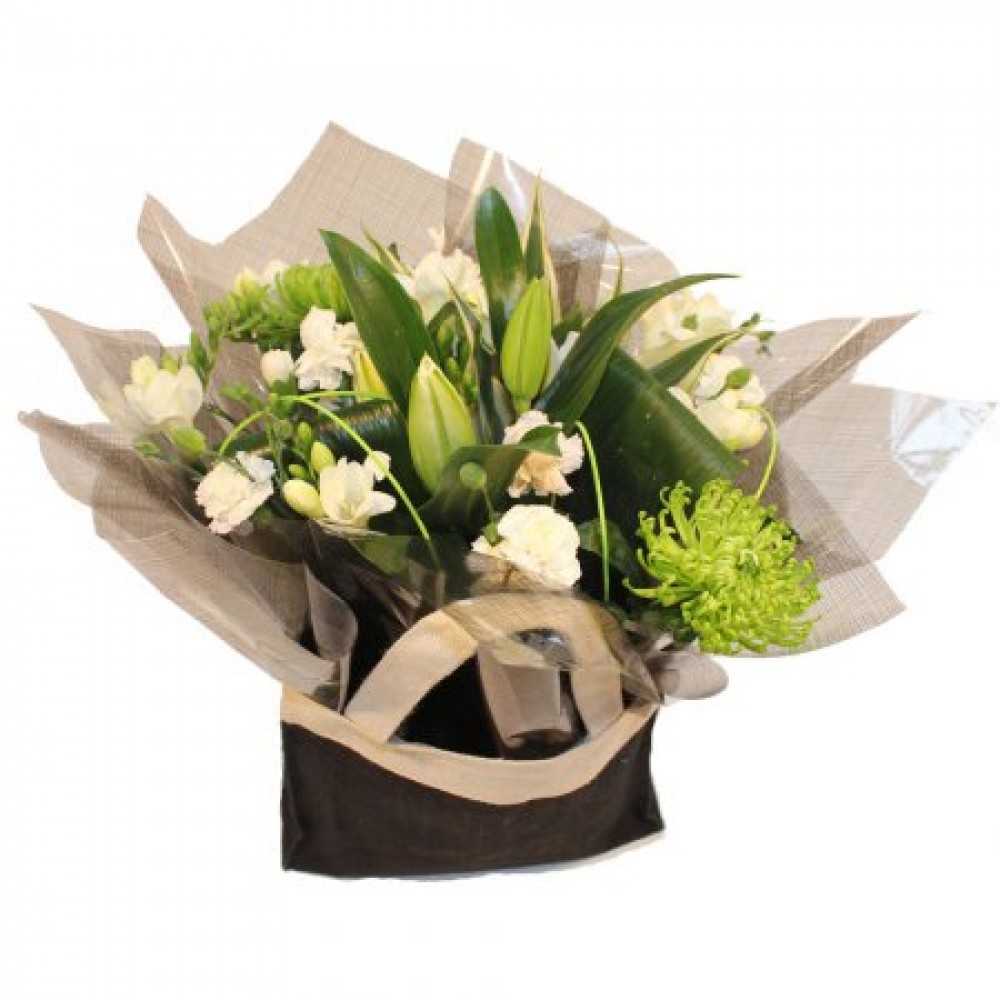 This hand-tied bouquet includes white lilies, fressias, carnations and green chrysanthemums blooms accompanied by simple and white roses set with palm leaves.