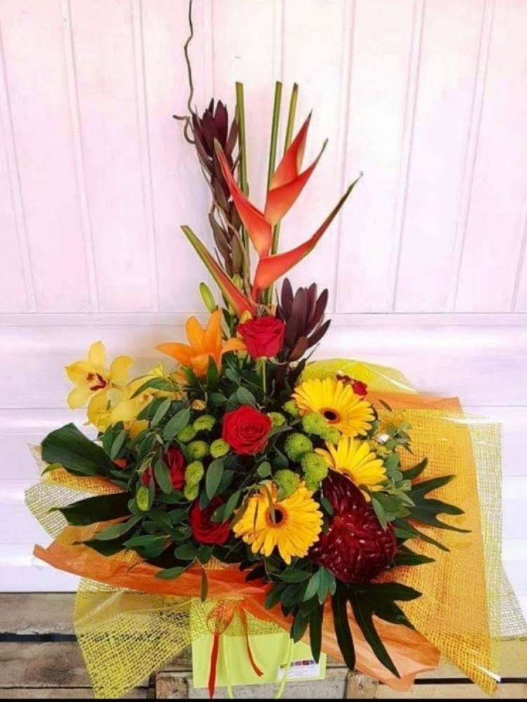 Arrangement contains Heliconia, Orchids, Roses, Gerberas, green Chrysanthemums and Strelitzia against green leaves.